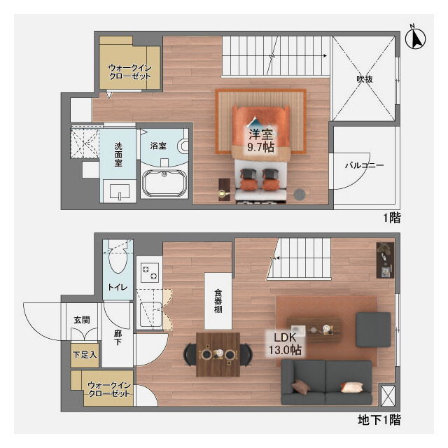 インターネット無料、メゾネット、バス・トイレ別、ガスコンロ設置可、システムキッチン、追い焚き、ウォークインクローゼット、CSアンテナ、BSアンテナ、フローリング、光ファイバー、TVインターホン、温水洗浄暖房便座、浴室換気乾燥機、独立洗面台 |